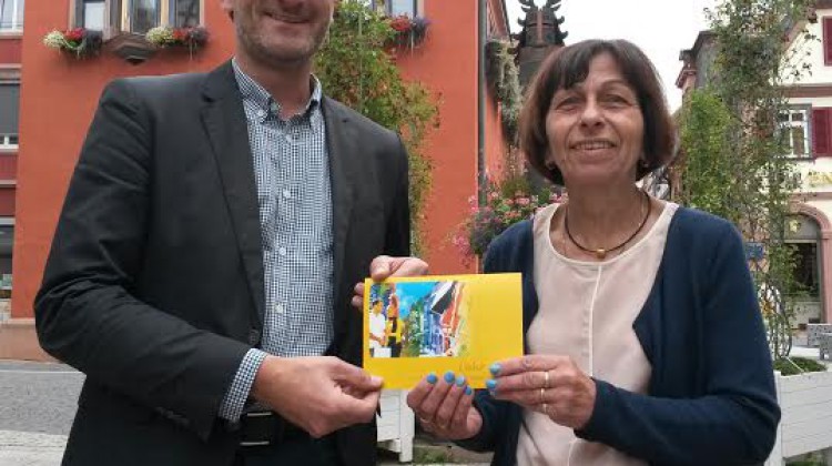 Michael Schmiederer 1. Vorsitzender der Lahrer Werbegemeinschaft freut sich mit der Gewinnerin Ulrike Brehm aus Sulz über ihren 1. Preis beim Gewinnspiel anlässlich des Rosentages und übergibt ihr einen Lahrer Geschenkgutschein i.H. von 300 €.